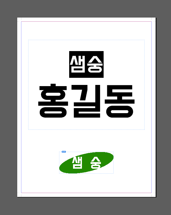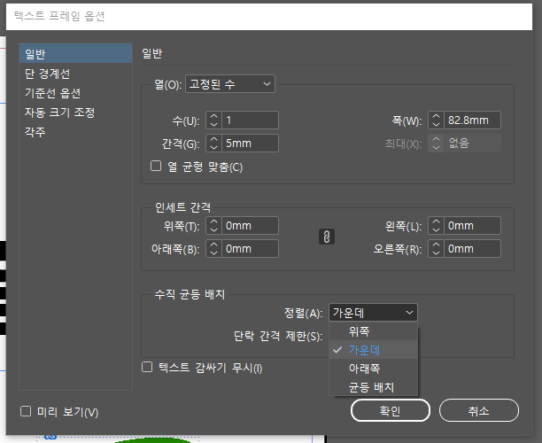 기본틀을 만들고 텍스트 상자를 넣습니다. 이때 텍스트가 박스 상단에 붙게 되는데 이게 보기 싫을 수 있습니다. 이때는 개체 > 텍스트 프레임 옵션 > 수직 균등 배치 > 가운데 를 설정해 주면 보기 좋게 됩니다.