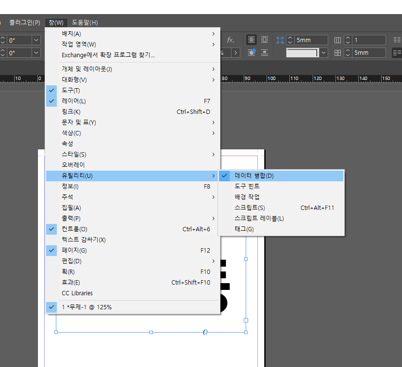 기본틀이 완성되었다면 처음에 유니코드 텍스트로 저장했던 명단을 불러와야 합니다. 명단을 불러오기 위해 데이터병합 메뉴를 선택합니다. 창 > 유틸리티 > 데이터 병합